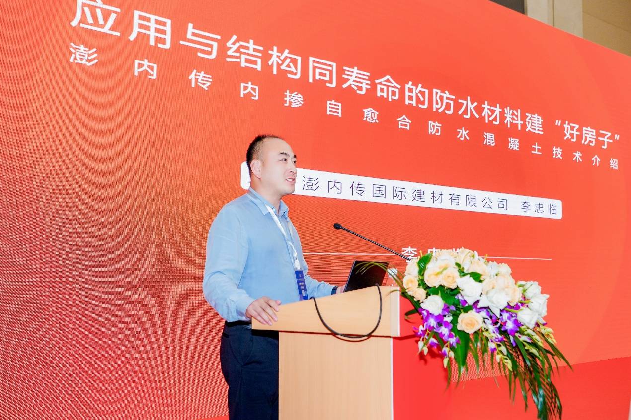 北京澎內(nèi)傳國(guó)際建材有限公司市場(chǎng)總監(jiān)李忠臨以《與結(jié)構(gòu)同壽命防水材料助力建造“好房子”》為題作了專題報(bào)告,首先總結(jié)分析了當(dāng)前建筑物滲漏的主要原因,然后介紹了澎內(nèi)傳防水系統(tǒng)的機(jī)理、性能與技術(shù)特點(diǎn),可從根本上解決滲漏問題,最后與大家分享了澎內(nèi)傳結(jié)晶自愈合防水混凝土在工程中的應(yīng)用情況。